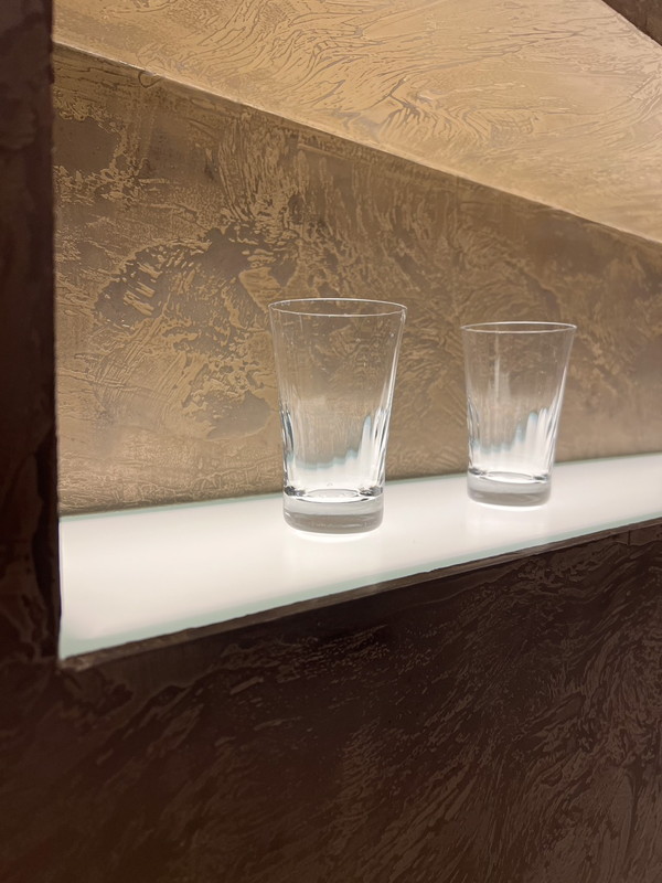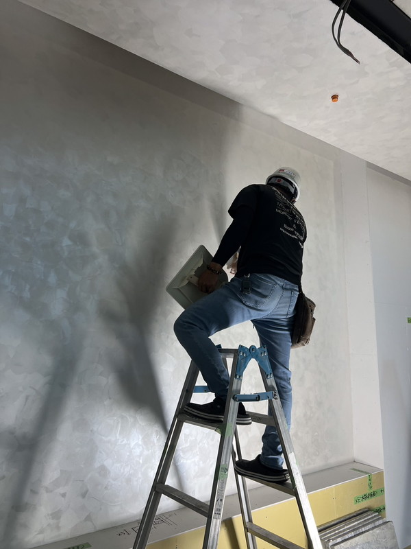 小粒のフレークが入っているベース塗料。さらに金銀のアディティブを入れることによって、独特な陰影・ムラ・光を反射するような質感に仕上がるのが特徴。自然にマットな質感を空間に演出してくれる。