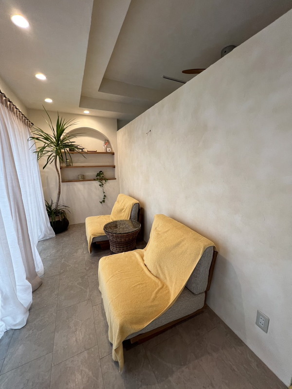白の塗り壁で統一されたシンプルな空間の中に、店舗のイメージカラーであるピンクベージュを、アクセントになるようメインの壁面にペイント。