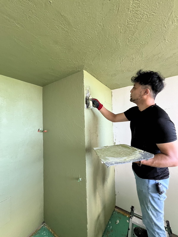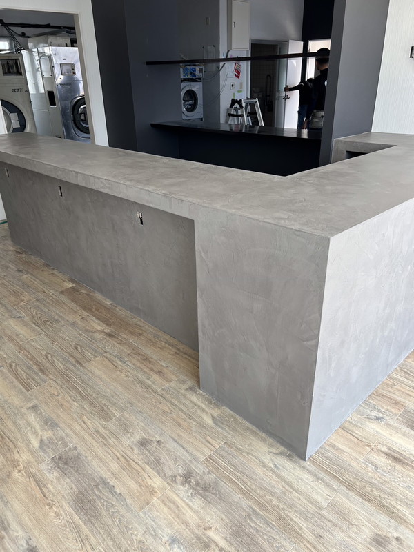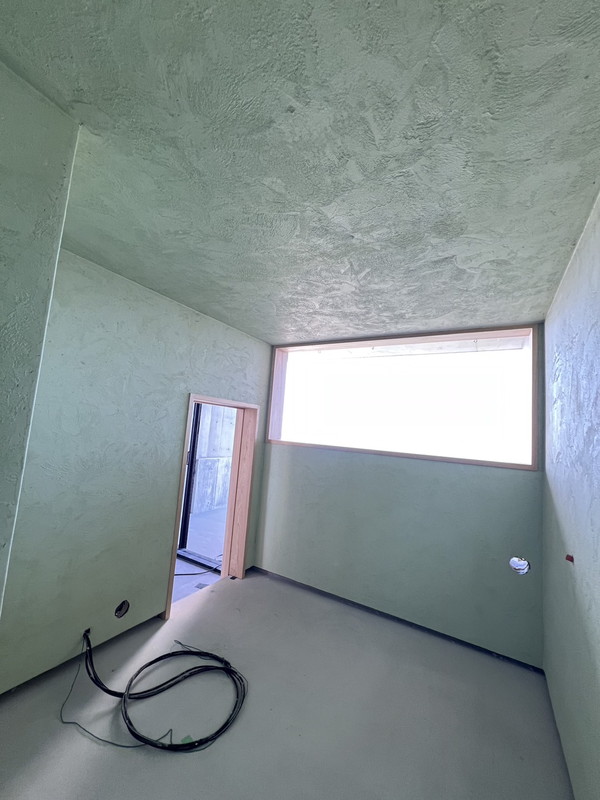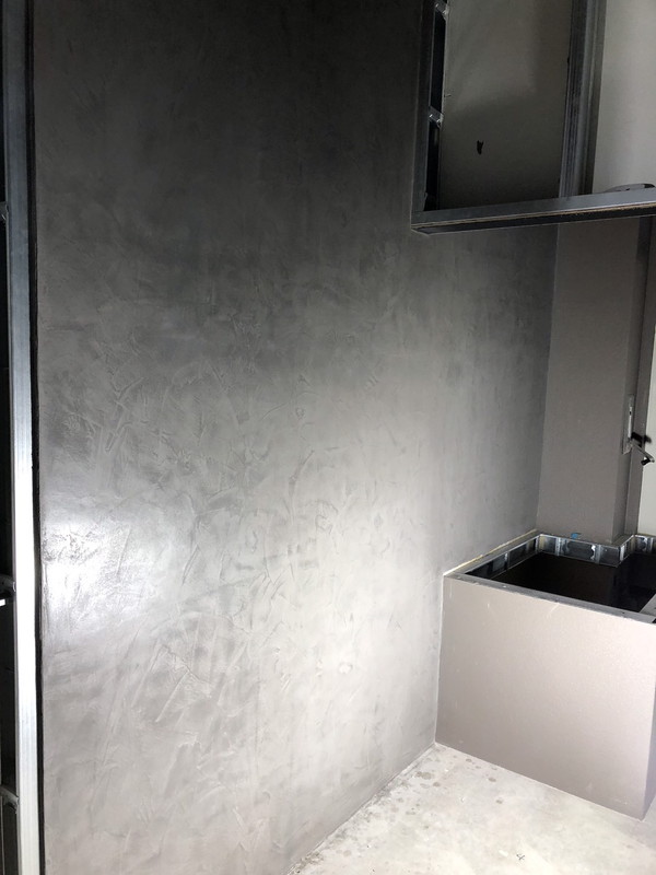 天然石ベースの塗料。ブラシやステンレスのコテで塗ることによって、自然とコンクリートのような風合いになり、自然石のような質感が生まれる。自然のライムの成分が含まれているので、細菌およびカビなどに対する抵抗力が備わっているペイント。